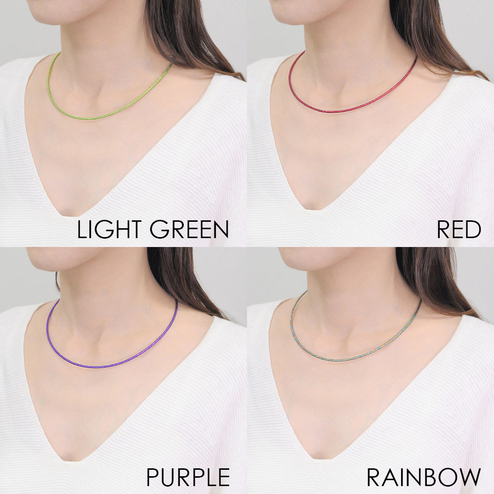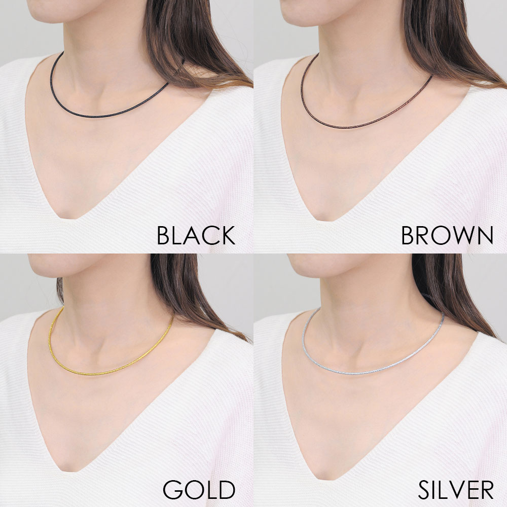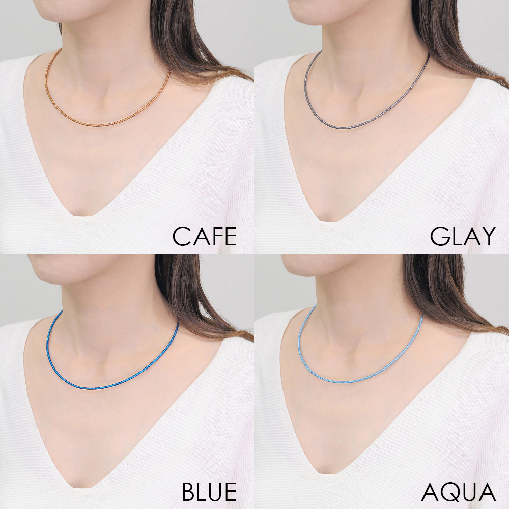 磁石の磁力をにより、留め具なしで簡単着脱が可能です。装着時最長45cmまでの長さで、自由なサイズに調整してお使いいただくことができます。ルーミンの磁気ネックレス部分は、イタリア製外皮素材を用いて、日本国内で熟練の職人により丁寧に製造されています。