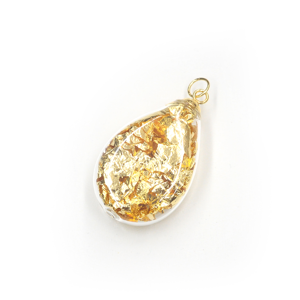 私たちは、ありのままの姿で使うというアイデアを思いつきました。 吹きガラスの中に金箔を挟み込み、しわや折り目をつけることで、金塊のような外観を作り出します。 泡が閉じると、金箔は内部で自由に動き回り、まるで空気中を舞い、光と戯れているかのようです。 これらのジュエリーは空気のように軽やかであり、金箔は空気中で自由に舞い上がっているのです!