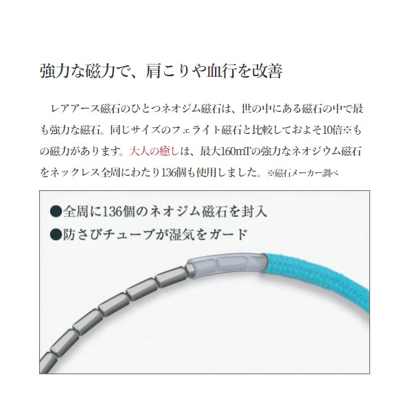 強力なネオジム磁石を136個使用し、1つ1つにカッティングを施しているのでしなやかな装着感。全体にネオジム磁石を入れることでネックレス全体で血行改善効果を発揮します!