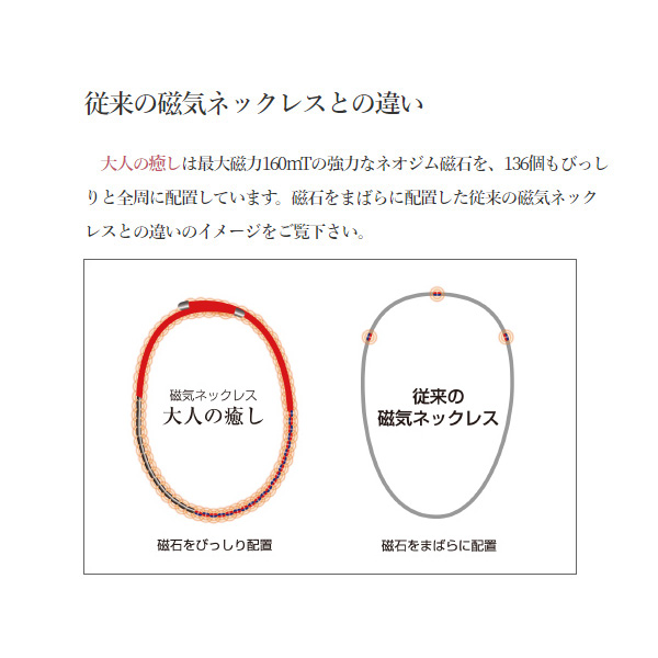 強力なネオジム磁石を136個使用し、1つ1つにカッティングを施しているのでしなやかな装着感。全体にネオジム磁石を入れることでネックレス全体で血行改善効果を発揮します!