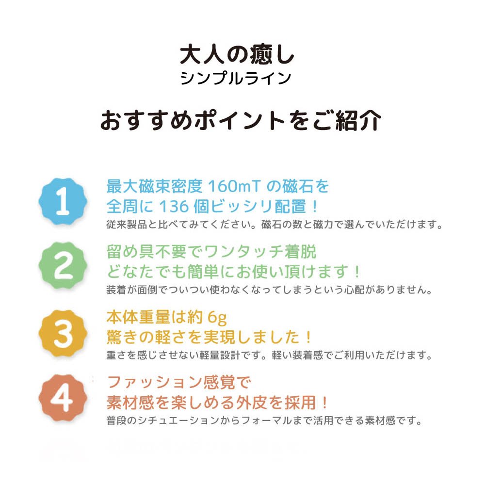 管理医療機器の認定を受けた磁気ネックレス。留め具がなく簡単に着脱していただけます。全長約55センチ(装着時最長45センチ)でお好みの長さに調整可能なフリーサイズです。