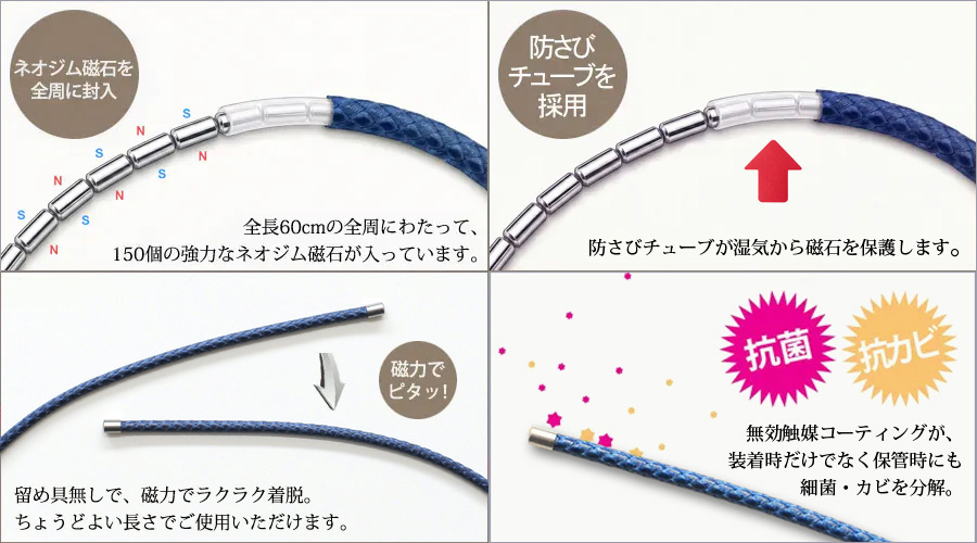 強力なネオジム磁石を150個使用し、1つ1つにカッティングを施しているのでしなやかな装着感。全体にネオジム磁石を入れることでネックレス全体で血行改善効果を発揮します!