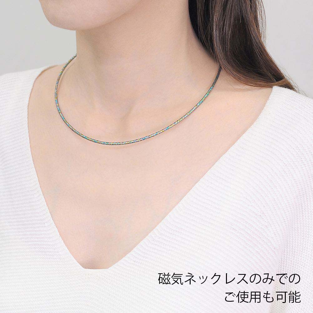 磁石の磁力をにより、留め具なしで簡単着脱が可能です。装着時最長45cmまでの長さで、自由なサイズに調整してお使いいただくことができます。ルーミンの磁気ネックレス部分は、イタリア製外皮素材を用いて、日本国内で熟練の職人により丁寧に製造されています。