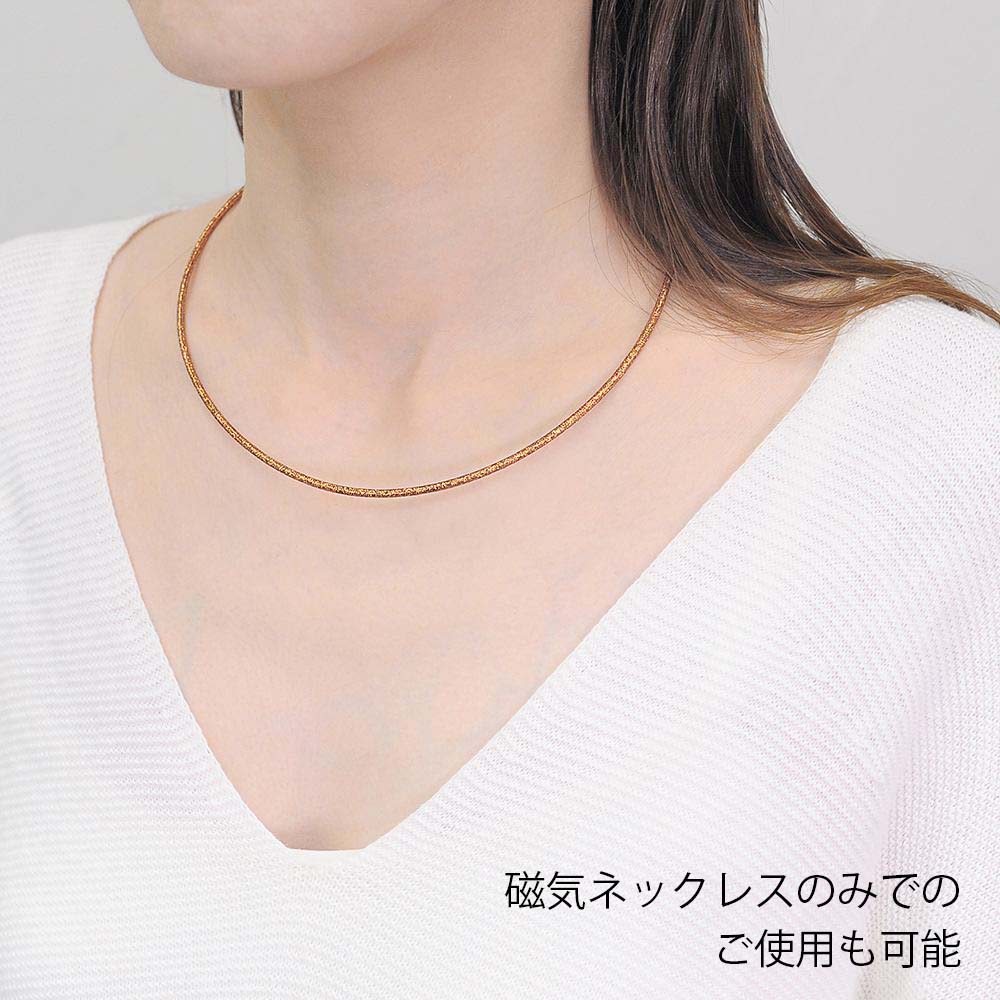 磁石の磁力をにより、留め具なしで簡単着脱が可能です。装着時最長45cmまでの長さで、自由なサイズに調整してお使いいただくことができます。ルーミンの磁気ネックレス部分は、イタリア製外皮素材を用いて、日本国内で熟練の職人により丁寧に製造されています。