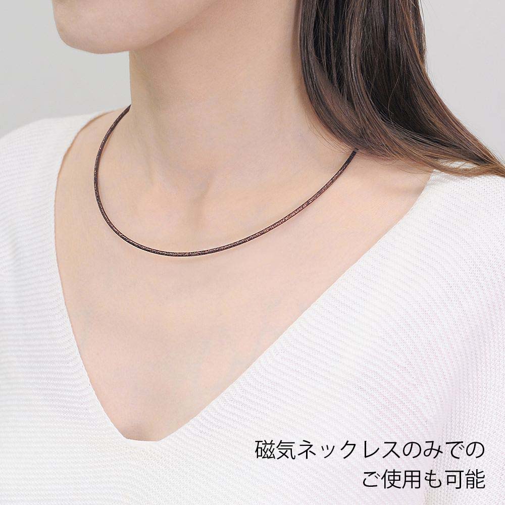 磁石の磁力をにより、留め具なしで簡単着脱が可能です。装着時最長45cmまでの長さで、自由なサイズに調整してお使いいただくことができます。ルーミンの磁気ネックレス部分は、イタリア製外皮素材を用いて、日本国内で熟練の職人により丁寧に製造されています。
