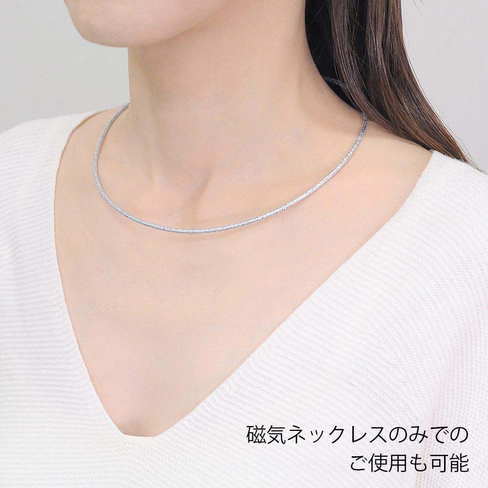 磁石の磁力をにより、留め具なしで簡単着脱が可能です。装着時最長45cmまでの長さで、自由なサイズに調整してお使いいただくことができます。ルーミンの磁気ネックレス部分は、イタリア製外皮素材を用いて、日本国内で熟練の職人により丁寧に製造されています。