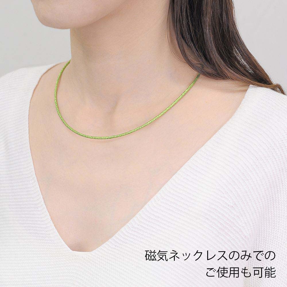 磁石の磁力をにより、留め具なしで簡単着脱が可能です。装着時最長45cmまでの長さで、自由なサイズに調整してお使いいただくことができます。ルーミンの磁気ネックレス部分は、イタリア製外皮素材を用いて、日本国内で熟練の職人により丁寧に製造されています。