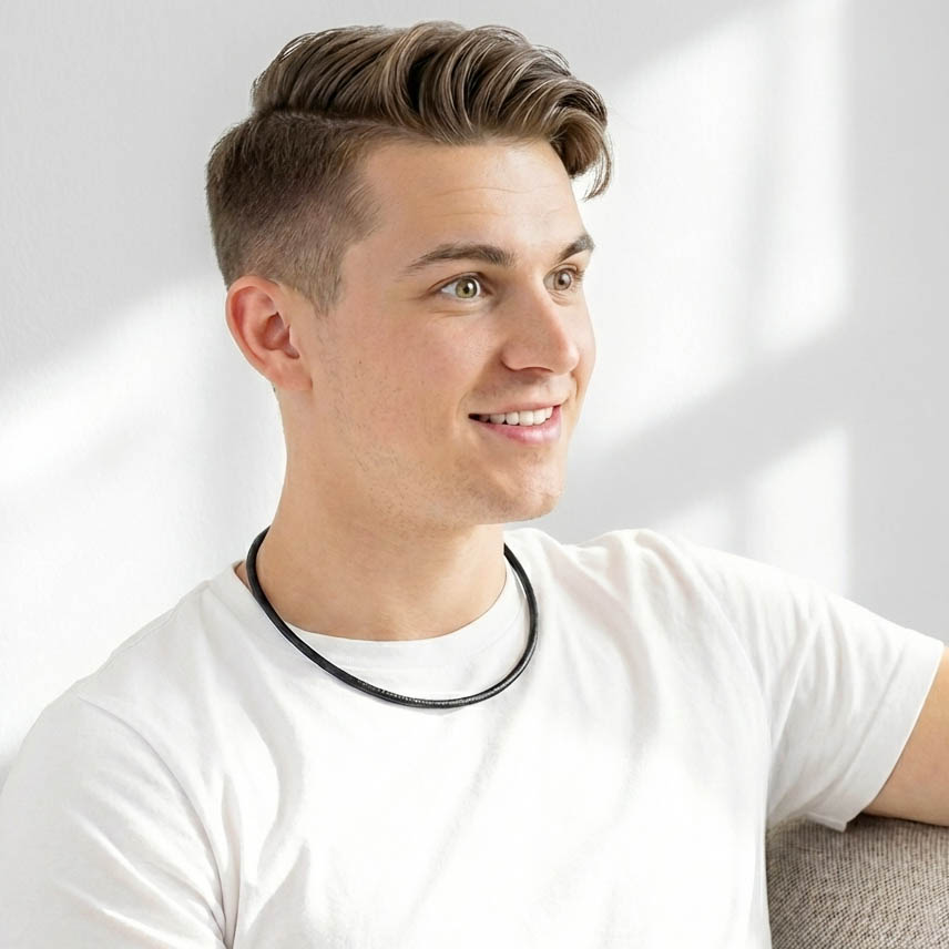 合皮の本体は約4mmであり、適度な存在感を感じるアクセサリーとしてお使いいただけます。オフのシチュエーションだけでなくお仕事中やお出かけの際にもご活用いただける、ファッション性に優れた家庭用永久磁気治療器です。