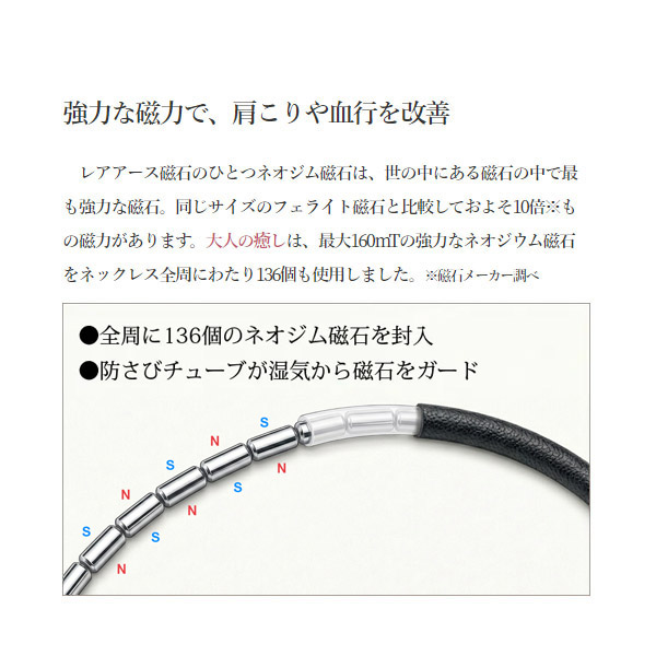 強力なネオジム磁石を136個使用し、1つ1つにカッティングを施しているのでしなやかな装着感。全体にネオジム磁石を入れることでネックレス全体で血行改善効果を発揮します!