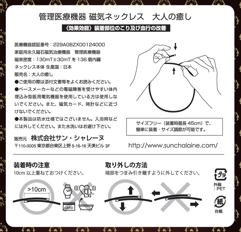 管理医療機器の認定を受けた磁気ネックレス。留め具がなく簡単に着脱していただけます。全長約55センチ(装着時最長45センチ)でお好みの長さに調整可能なフリーサイズです。